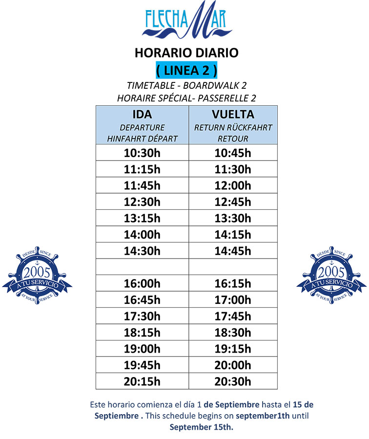 NOTA: Los horarios pueden cambiar por causas ajenas a la empresa o para garantizar la correcta prestación del servicio. En caso de discrepancia, los horarios oficiales son los publicados en nuestra taquilla de atención al cliente.